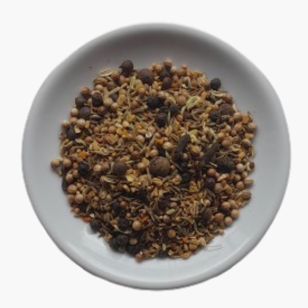 Ingredients: Cumin, coriander, cloves, turmeric, fenugreek, fennel, ginger, mustard, black pepper, allspice and chilli.