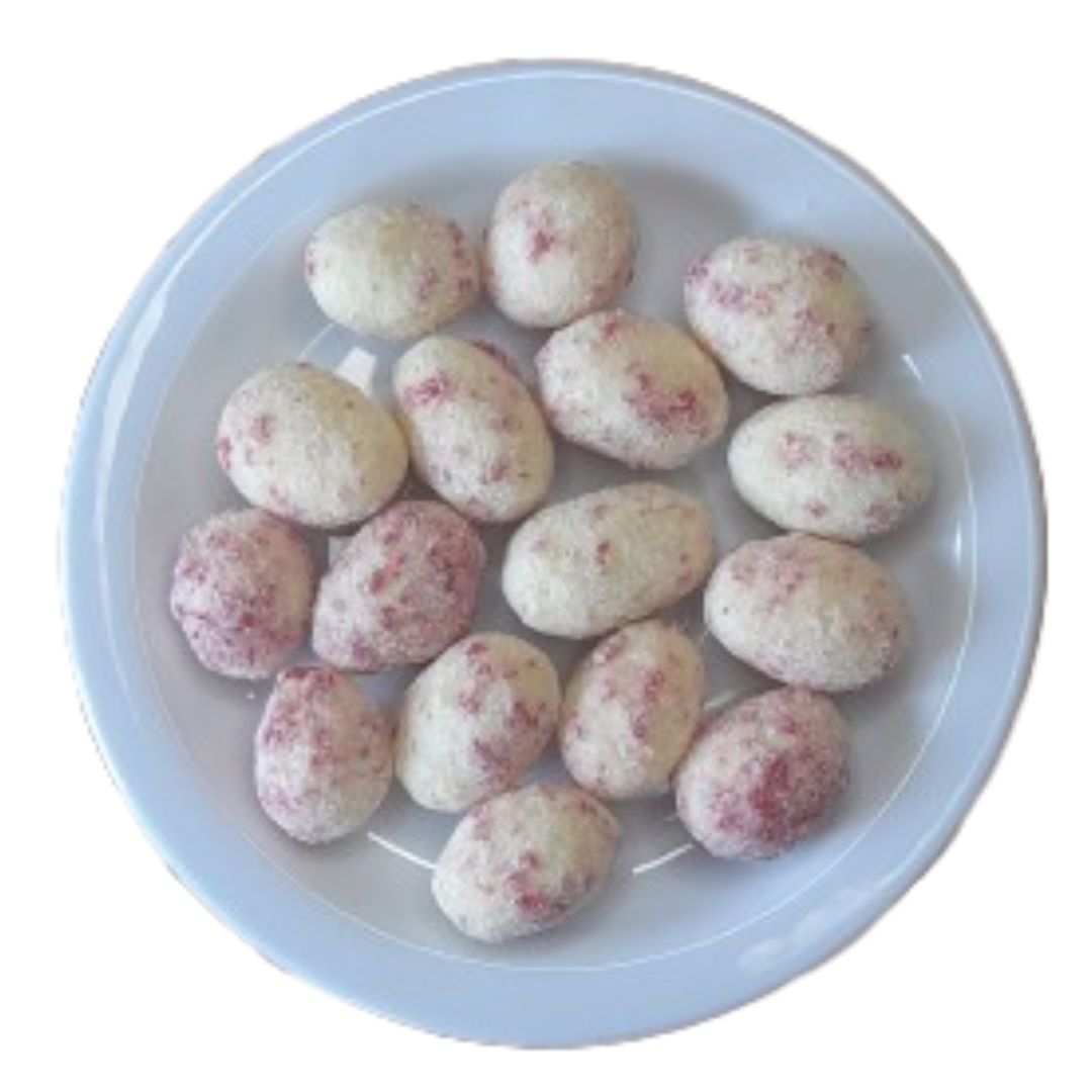 Ingredientes: chocolate branco (70%) (açúcar, manteiga de cacau, leite gordo em pó, leite magro em pó, lactose, manteiga concentrada, emulsionante: lecitinas (soja); e aroma), miolo de amêndoa (23%) e flocos de framboesa (7%), açúcar, amido de milho, sólidos de fruta (framboesa), regulador de acidez: ácido cítrico; e aroma.