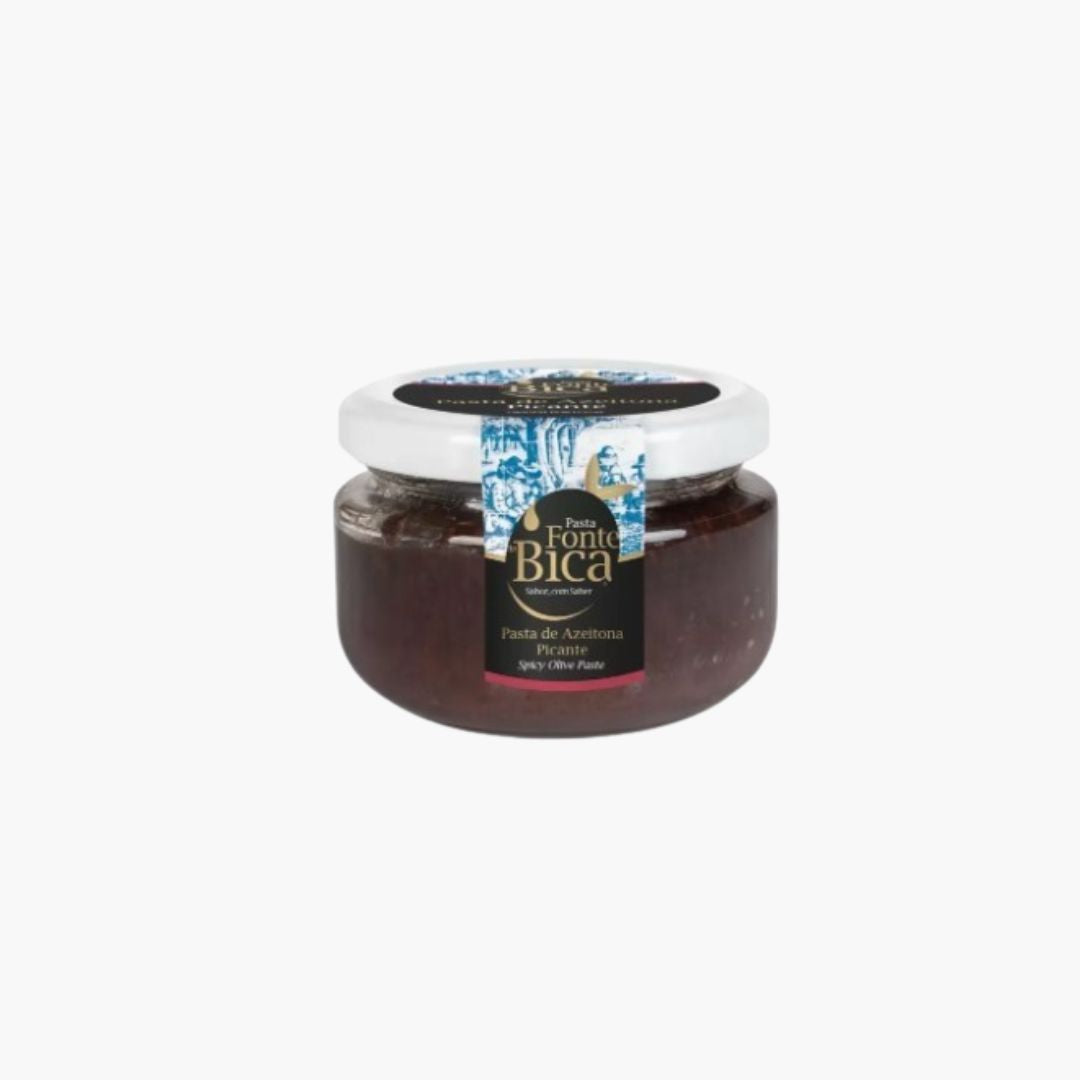 Pasta de azeitona preta galega picante é combinado com azeite virgem extra, alho, sumo de citrinos, piripiri e ervas aromáticas.
