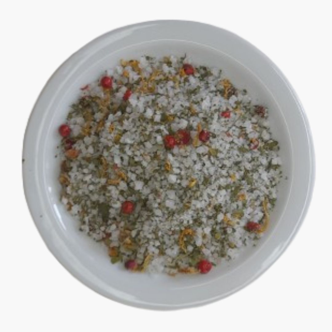 Ingredientes: Sal de Rio Maior, Coentros, Funcho, Limão e Pimenta Rosa